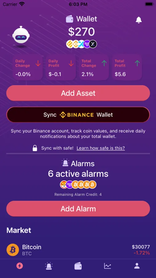 - Alarm system: Use WalletBot's alarm system to get notifications when the price of an asset on the Binance market changes
