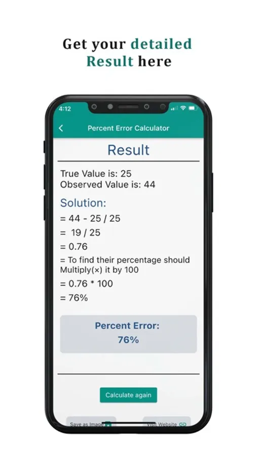 Percentage Error Calculator is a simple and useful app. It auto-calculates the percent error of given values and provides you with the detailed results of the formula with a step-by-step solution. So that you can clearly understand the whole process of this calculator.