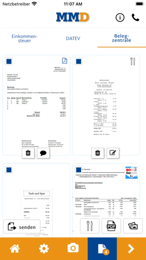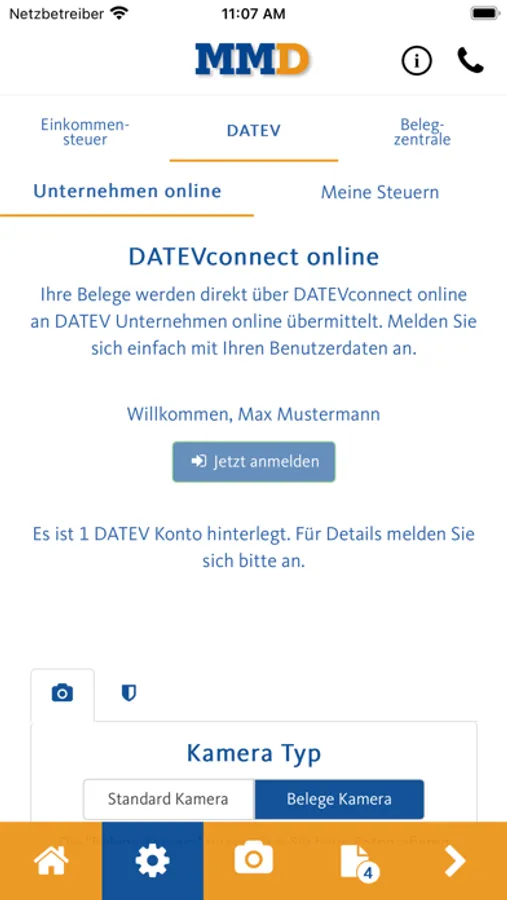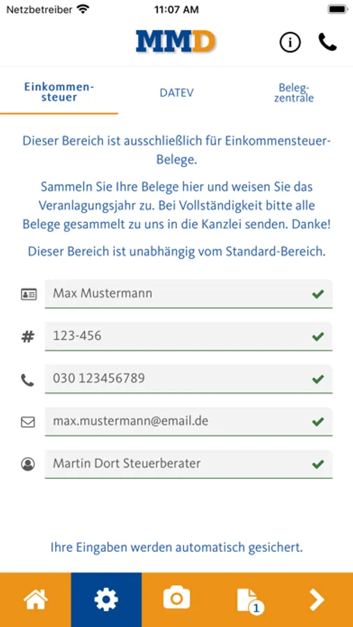 Machen Sie einfach ein oder mehrere Fotos von Ihren Belegen und versenden Sie diese mit einem Klick direkt aus der App heraus an Dort Martin Steuerberater