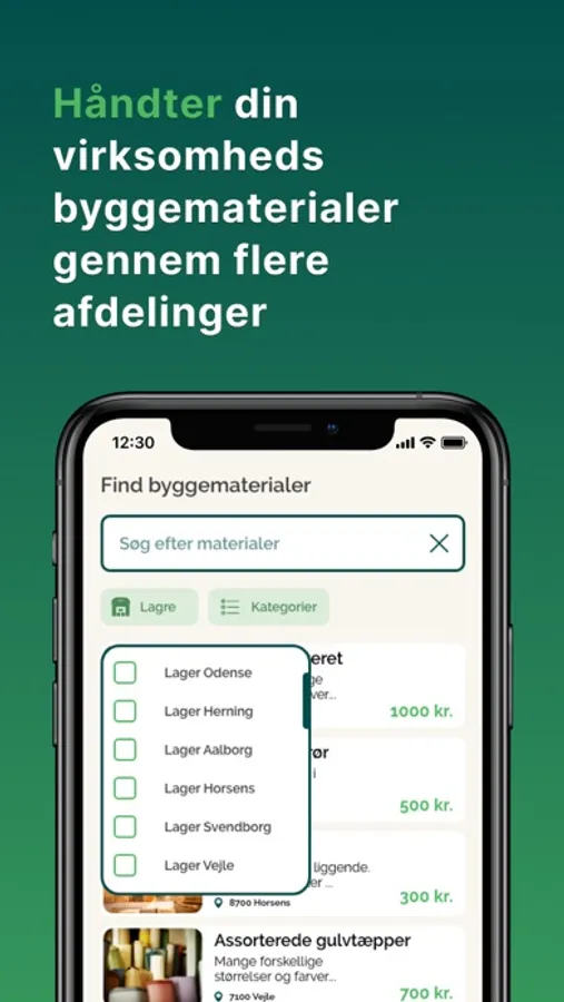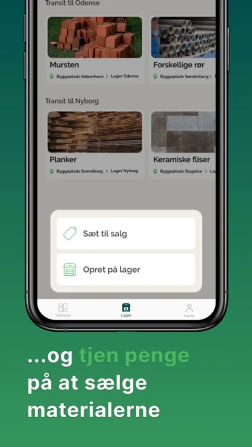 Du kan også bruge appen til at sætte materialer til salg, når du rydder op på dit lager eller til at sælge gode materialer, når du river ned.