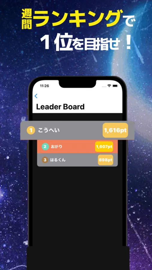 LeaderBoard上では、全ユーザーの1週間のスコアランキングが確認できます。