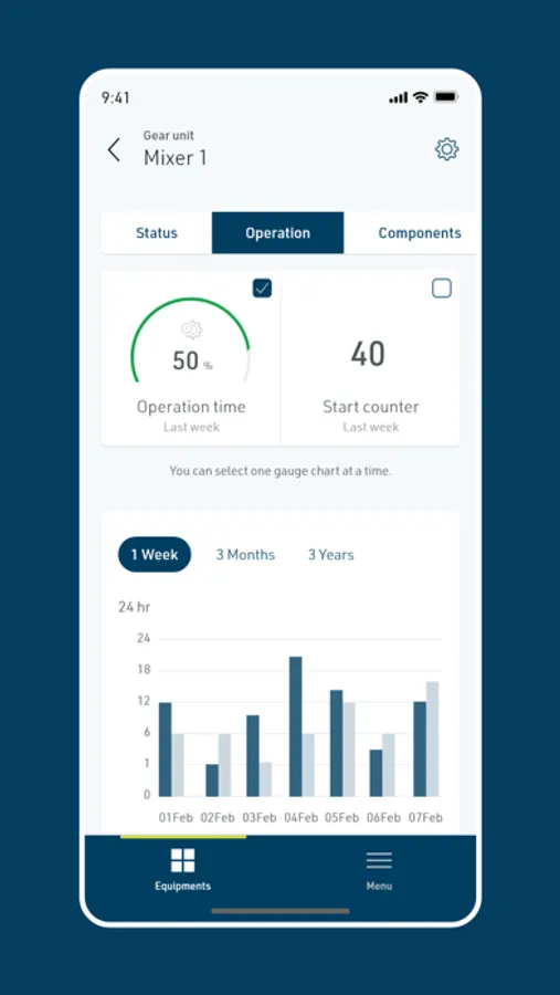 In local mode, the AIQ app will provide a dashboard, visualizing not only the health status of your asset, but also live data for commissioning and historical trend data of gear unit operation.