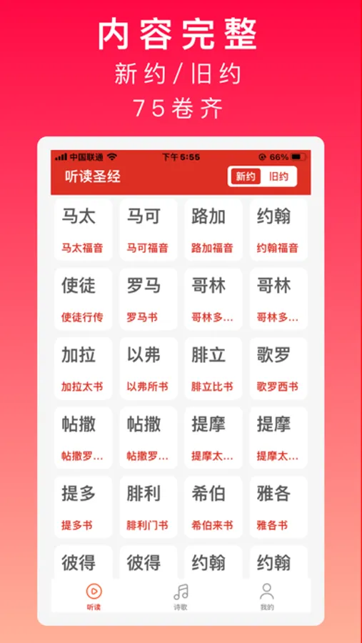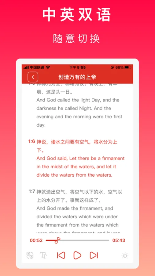 - 中英双语:提供中文与英文版本《圣经》,默认语言为中文 ,也可切换至中英文版本;