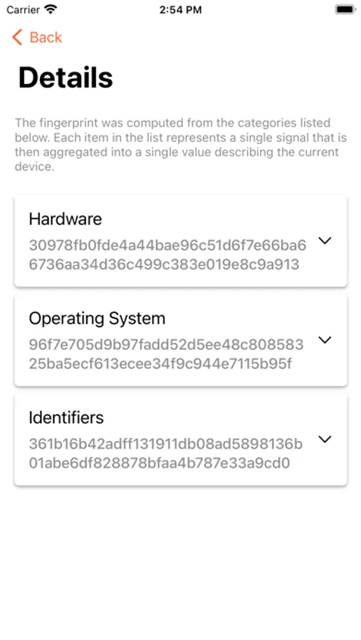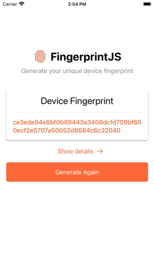 An application that showcases the capabilities of FingerprintJS open source library for iOS. It computes a fingerprint of the device without actually sending any data anywhere to avoid a privacy breach. It also displays the details about the raw data that was used to calculate the fingerprint value.