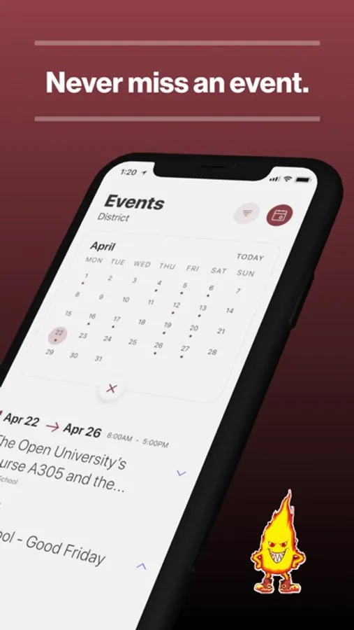 The event section shows a list of events throughout the district. Users can add an event to their calendar to share the event with friends and family with one tap.