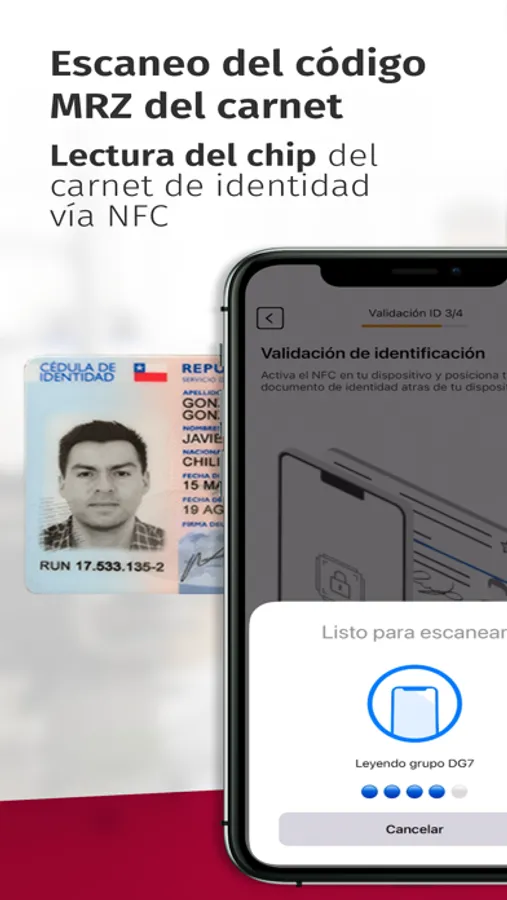 Esto es a través de una captura para extraer los datos del ID. Entre los que se encuentran; fecha de nacimiento, código de identificación y fotografía de rostro. Una vez que se validan los datos, se realiza la lectura del CHIP con tecnología Near Field Communication (NFC).