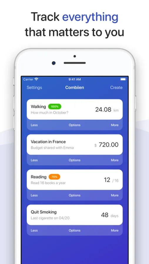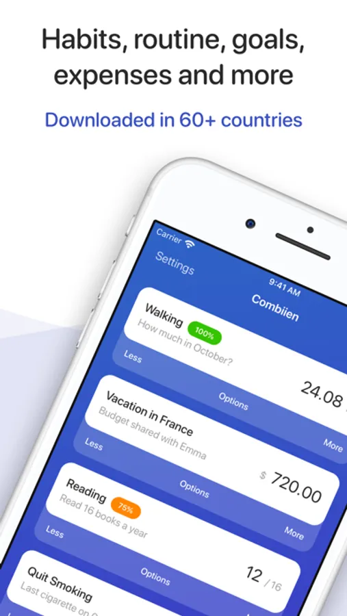 Combiien helps you easily track everything that matters to you: habits, routine, goals, expenses and more.