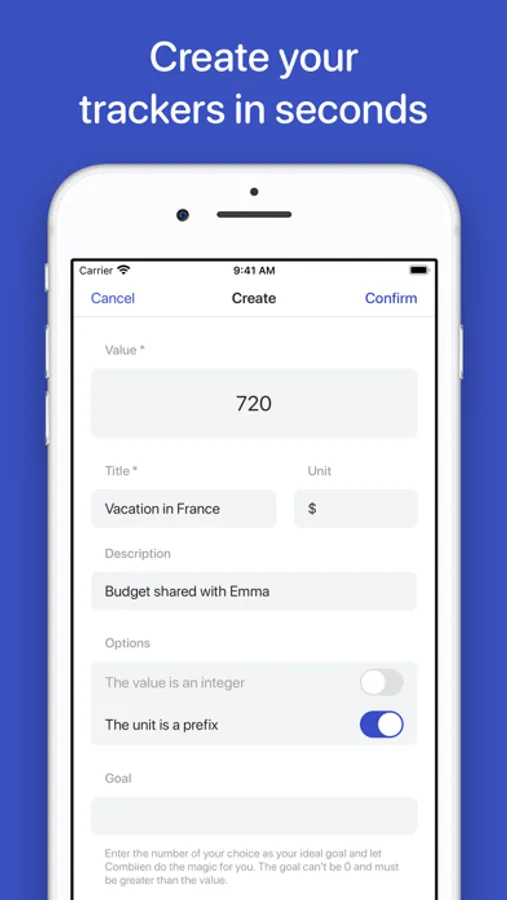 Track everything that matters to you. An history for each tracker. Set a goal for each tracker. Create your trackers in seconds.