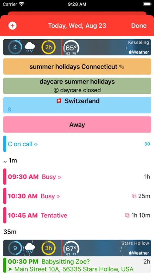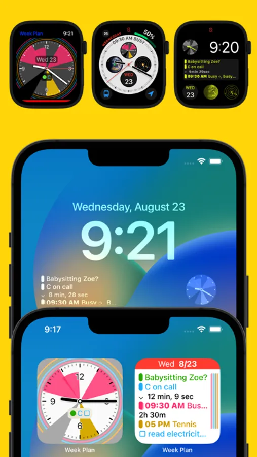 - The "Clockface" widget visualizes the events of the next 10 hours on an analogue dial.