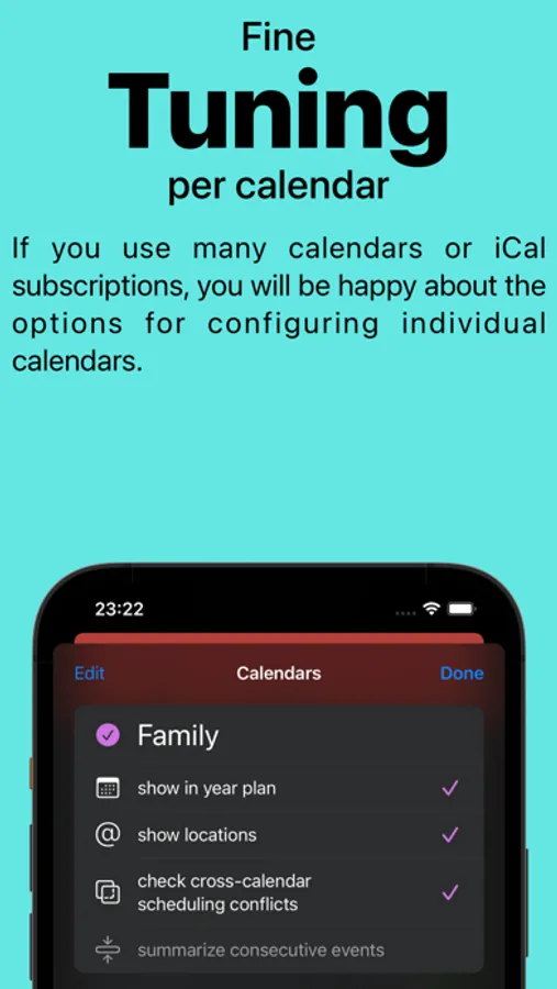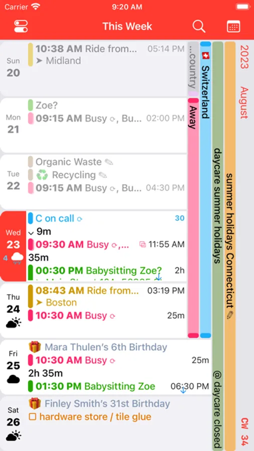 A clearly designed calendar which is based on the classic weekly overview. No login required because the app works on the calendar/reminder data of the operating system.