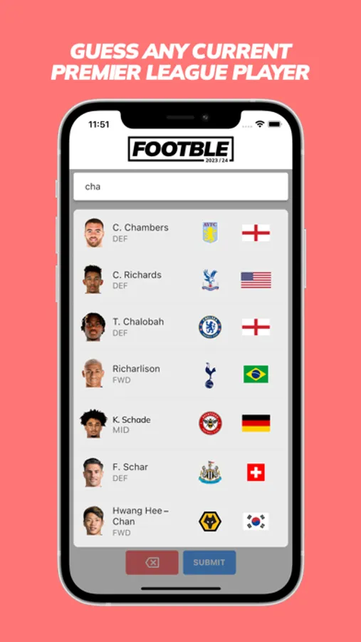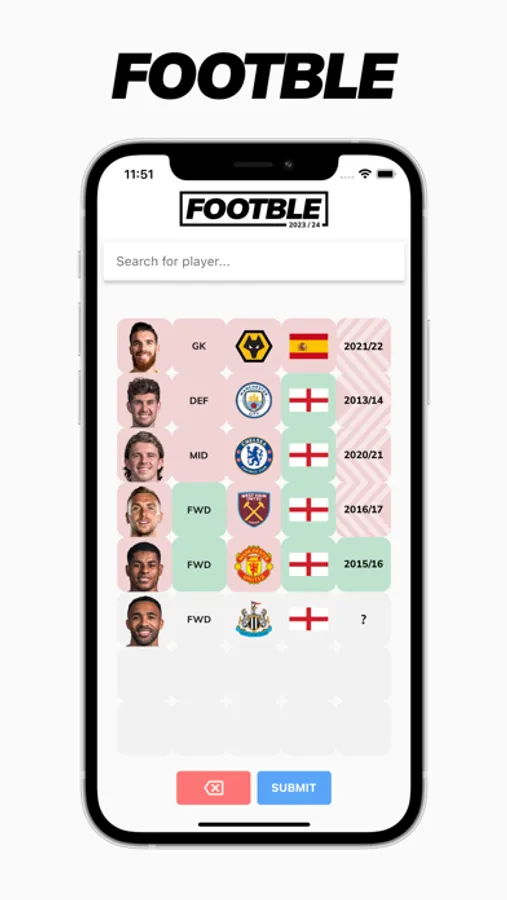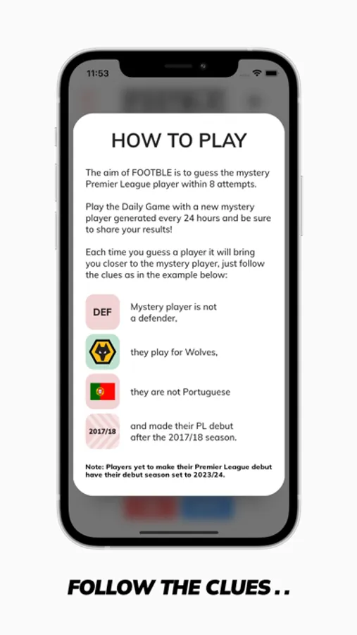 Footble is a daily puzzle in which everyone tries to reveal the Mystery Player of the day! By guessing current players, you must follow the clues to bring you closer to the big reveal. You have eight attempts to see if you can unmask the Mystery Player. But be warned! If you fail to guess the Mystery Player in your eight attempts you may never know his true identity! Be sure to share your results with friends, family and online to see who can find the Mystery Player in the fewest number of guesses.