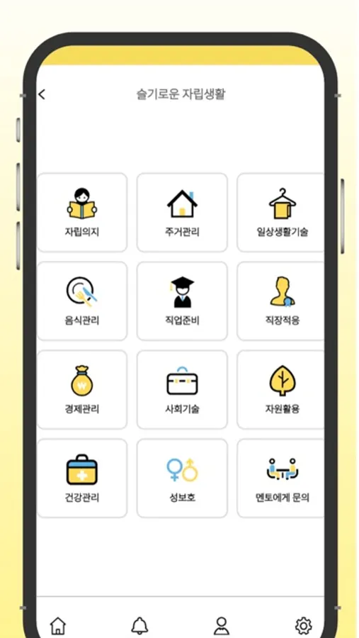 맞춤형정보는 자립의지, 주거관리, 일상생활기술, 음식관리, 직업준비, 직장적응, 경제관리, 사회기술, 자원활용, 건강관리, 성보호 등 총 11개 요인으로 구분하여 쉽게 정보를 확인할 수 있으며, 요인 내 세부 자립정보는 카드뉴스 형태로 추가적으로 제공이 필요한 정보는 별도 링크 및 영상을 제공하여 편리한 사용이 가능합니다.