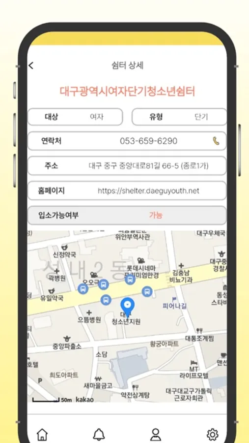 - 지역검색 또는 현재 위치 기반 검색을 통한 청소년쉼터 검색