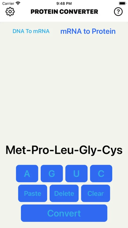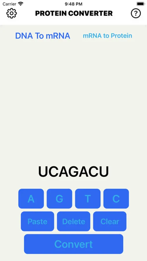 The app will convert DNA to mRNA as well as mRNA to Amino Acids.