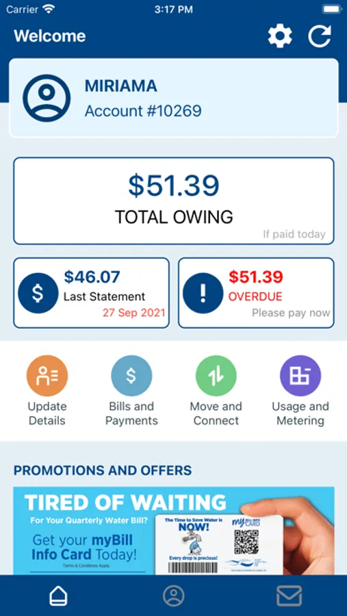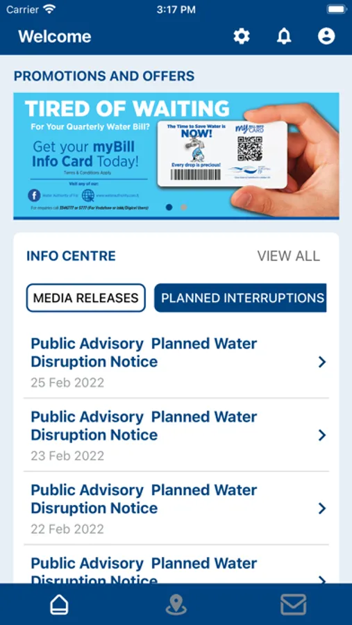 Get real-time updates on balance, overdue amount and statement due date with the WAF App. View water consumption history and bill copies conveniently from your mobile device. Receive updates on service disruption notices, bill reminder alerts and WAF News.