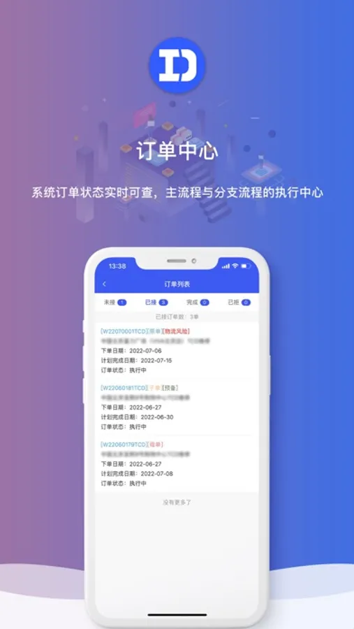 2、订单中心:系统订单状态实时可查,主流程与分支流程的执行中心;