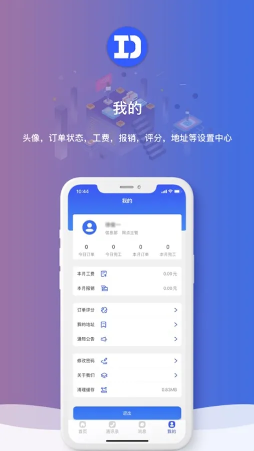 5、我的:头像,订单状态,工费,报销,评分,地址等个性化设置中心。