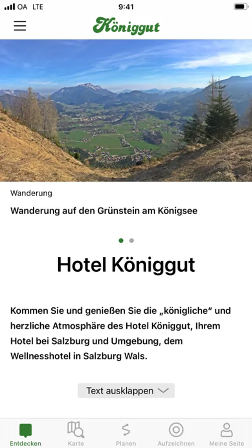 Wir bieten Ihnen mit dem Königgut App qualitativ hochwertige Touren und übersichtliche Tourenbeschreibungen für den Sommer und Winter in Salzburg. Wanderungen, Spazierwege, Laufstrecken, Mountainbike- und Rennradtouren für den Sommer und Skitouren, Langlaufstrecken, Winterwanderungen und auch Rodelausflüge. Im Königgut App finden Sie Empfehlungen für Themenwege, Burgen, Museen, Freibäder, Badeseen… Unter „Unser Haus“ finden Sie auch aktuelle Angebote, Impressionen, die aktuellen Sonntagsbrunch Termine, alles für Ihre Feier im Hotel Königgut und noch viele mehr!