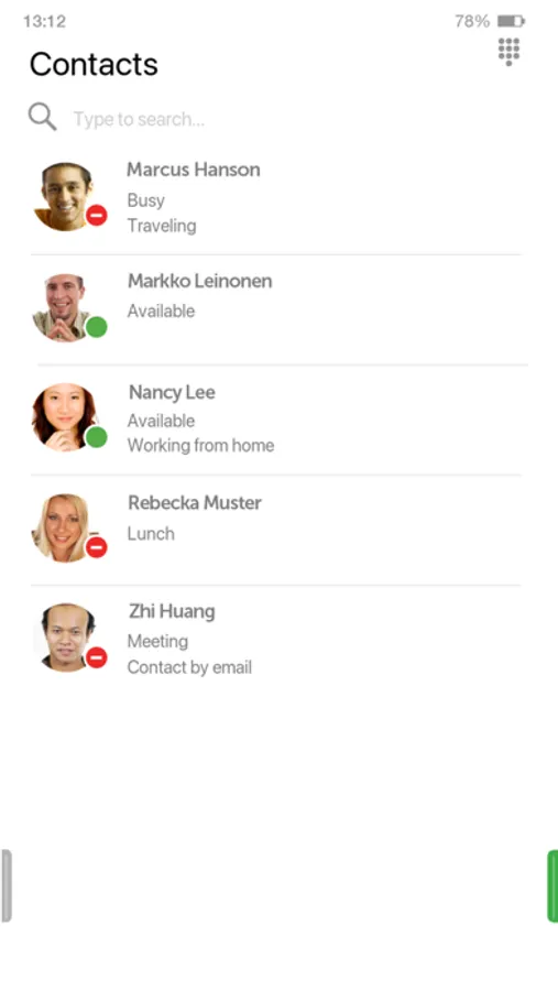 Du kan i realtid se status på dina kollegor. Då vet du vem som är tillgänglig, vem som jobbar från tåget och vem som är upptagen i möte.