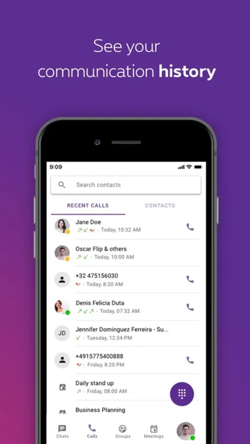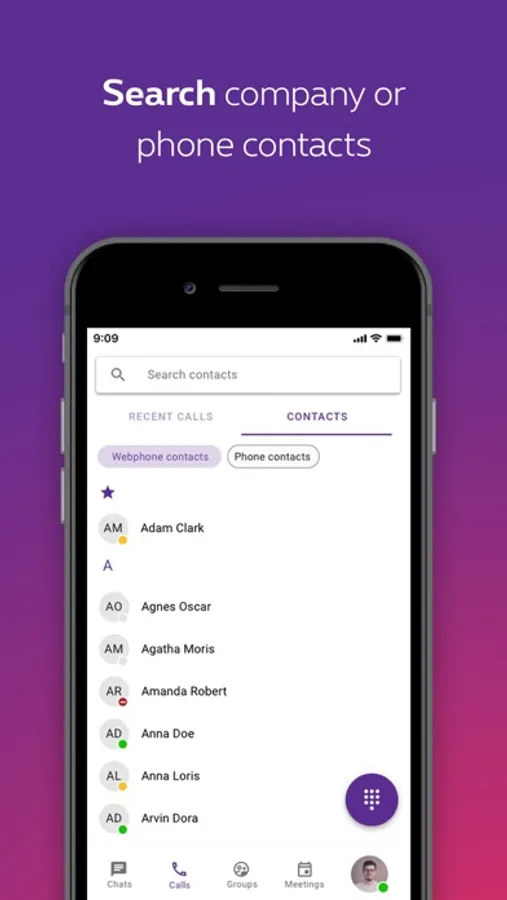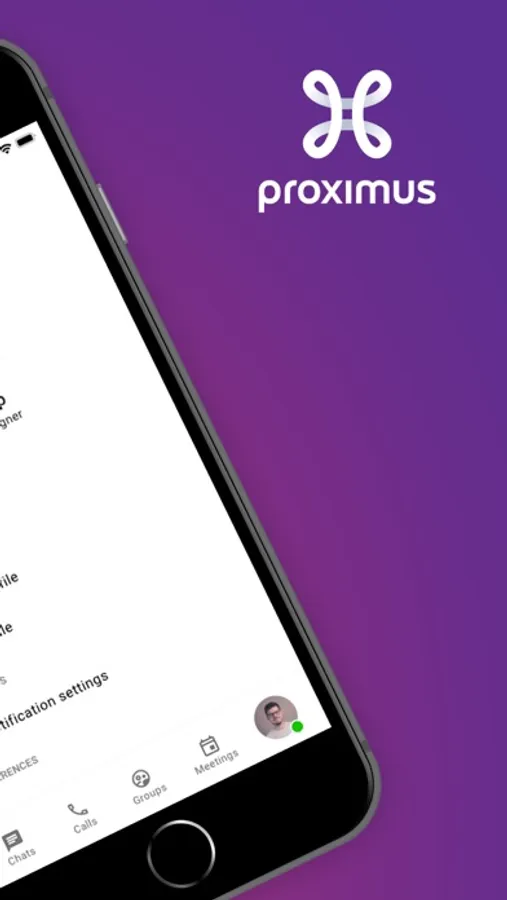 With Proximus Webphone you can make and receive company calls. With the user profile you manage your availability and decide when you want to receive calls. Together with this mobile app it is possible to use a web-client in your browser with the same calling capabilities. Dual ringing is possible to receive calls both on web and mobile app. If not available on web or app, calls are still received on your fixed company phone. Ongoing calls can be continued between web and app to improve mobility. Within the company all users are visible with their availability and status. This information can be used to contact a colleague via chat. Image and file sharing is also possible. Also chat Groups can be set up. Call history and all shared information in chats is available on both platforms, web and app. Meetings can be organised with audio, video, and sharing capabilities.