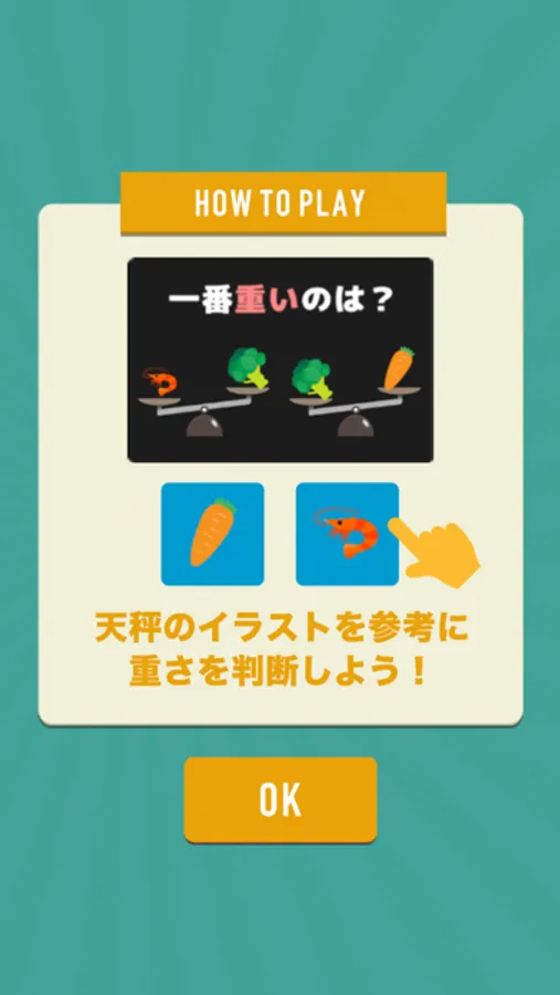 イラストをヒントに、お題の重さのものをタップするだけ。