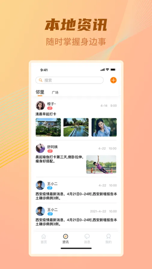 【资讯广场】社区居民生活服务资讯内容平台,发布自己的资讯动态、社区居民可线上互动交流,了解新闻热点动态