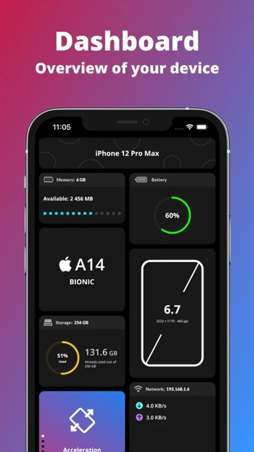 - Dashboard : RAM, Internal Storage, External Storage, Battery, CPU, Sensors Available, Tests, Network and Settings App