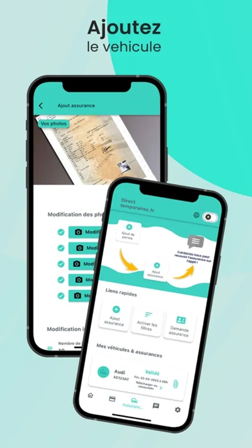 2eme étape : Ajoutez le véhicule a assurer (photos du véhicule + carte grise) + ses infos et la durée désirée.