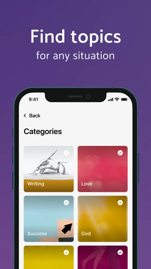 From a variety of topics, choose those you want to focus on. The app includes a wide range of topics such as love quotes, religion, success, humor, words of wisdom, motivational, daily inspiration quotes, life quotes, encouraging word, mental health quotes, self motivation (and many more), as well as a selection of carefully designed themes to choose from - updated frequently.
