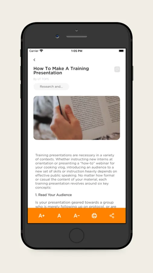 This product is an educational mobile app and companion desktop website offering various topics and articles regarding public speaking and learning how to be better at it. Articles can be listed under “favorites” for future reference, easily printed, and shared. Feedback can be given via polls and open-ended questions while a “Mini Chat” feature enables pre-registered and pre-approved users to engage in a non-moderated chat session for one-to-one advise.