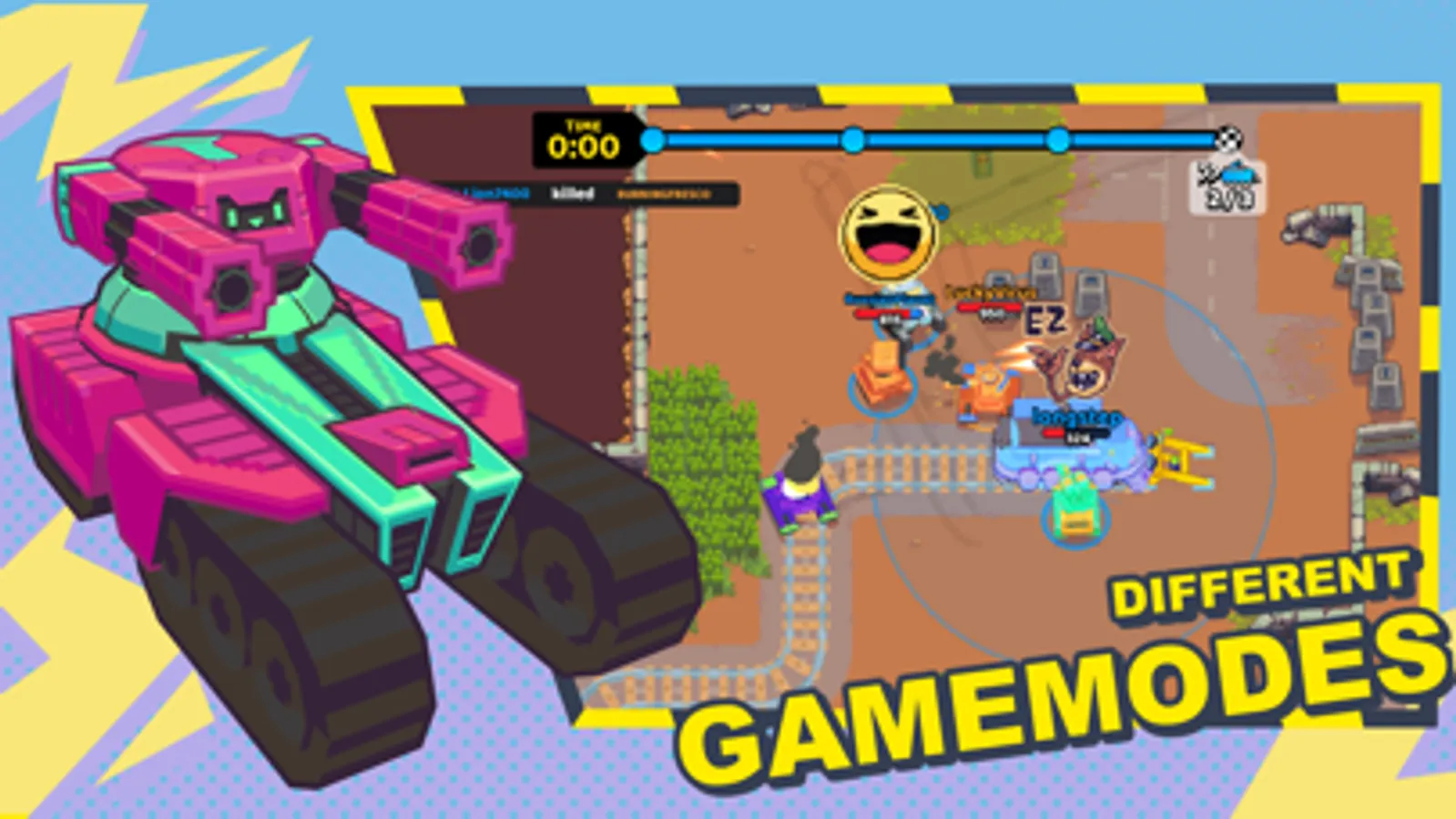 Select your favorite dog avatar and tank to start the battle. Use tank parts to customize and build your own tanks. Each tank consist of the following parts: chassis, turret and body. Use tank parts to start crafting new parts and level up! Let's start battling!
