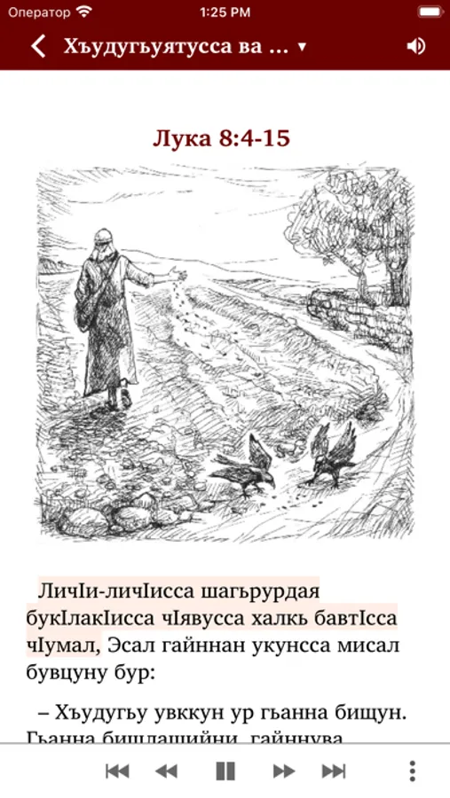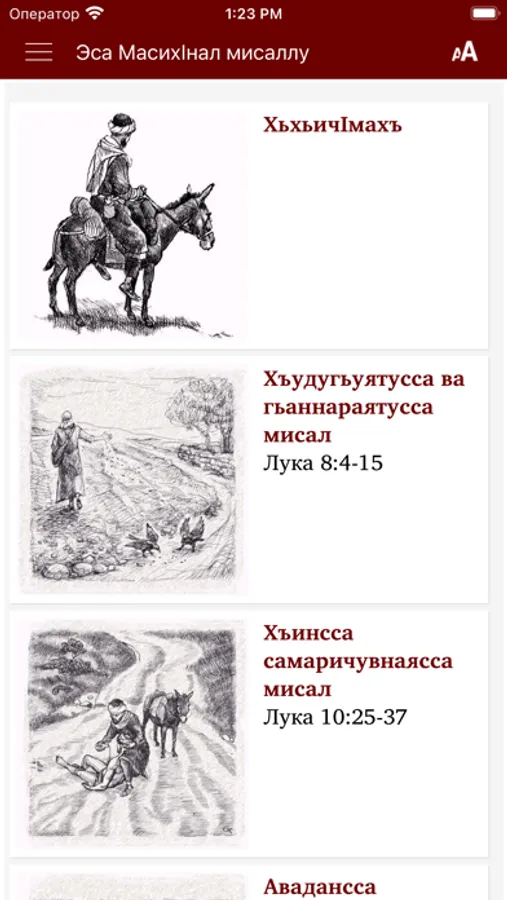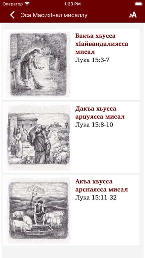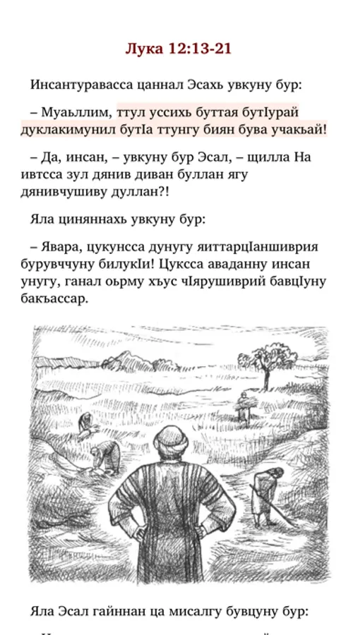 This Scripture app facilitates Bible study in the Lak language. It is a unique app that provides access to Gospel Parables in Lak. All of these parables are taken from the Gospel of Luke.