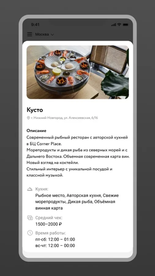 - подробная информация о каждом ресторане: меню, кухня, средний чек, время работы, контакты, адрес