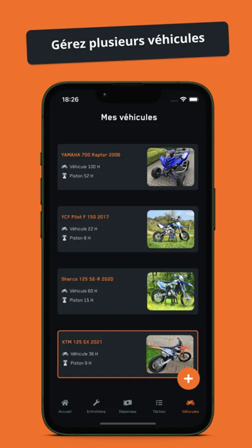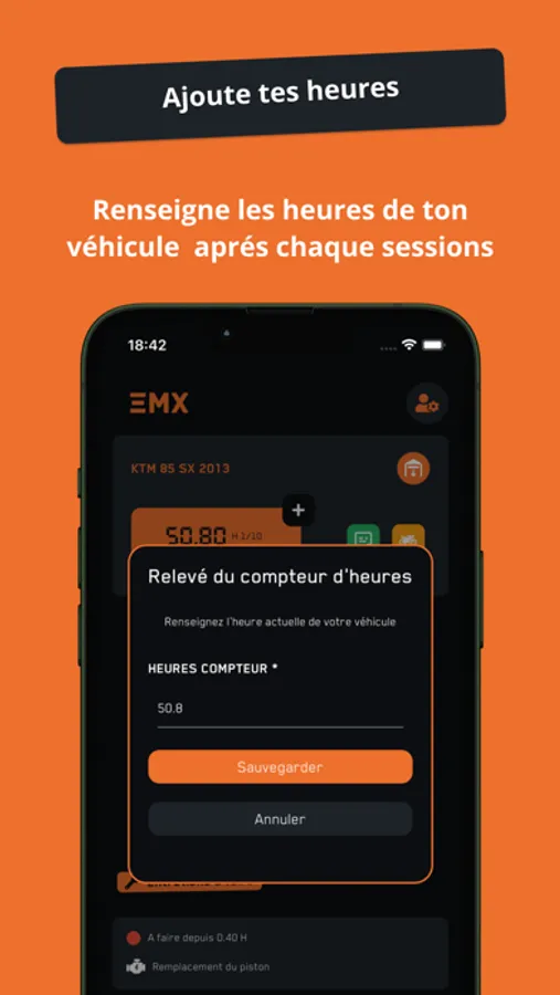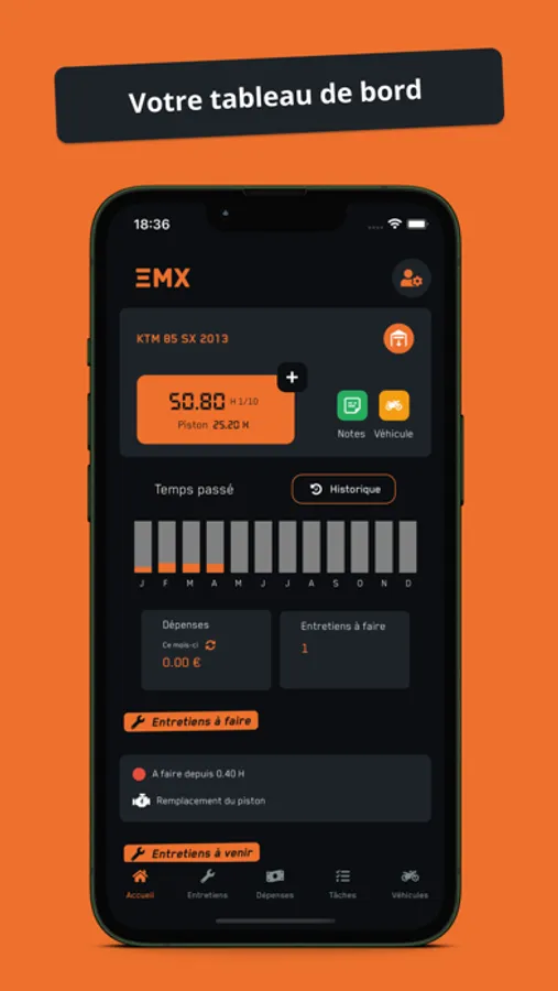 Entretien MX est une application dédiée à l’entretien des véhicules tout-terrain "cross,enduro,quad,dirt bike". Elle te permet de suivre en temps et en heure la maintenance de ton véhicule tout terrain. Configure la fréquence de tes entretiens, ajoute les heures de chaque session, et tu n’auras plus besoin de faire des tableaux Excel, ni de calculer la fréquence de tes entretiens. Configure ton véhicule et roule l’esprit tranquille !