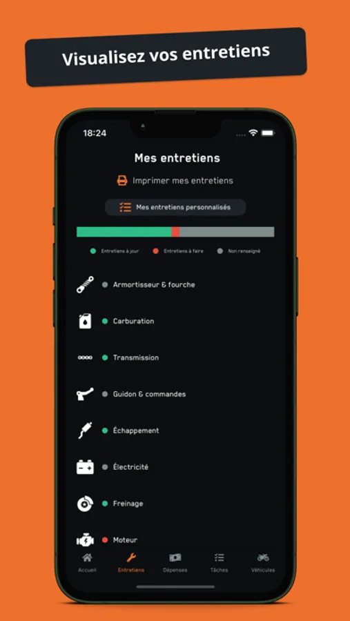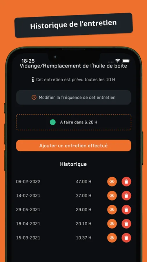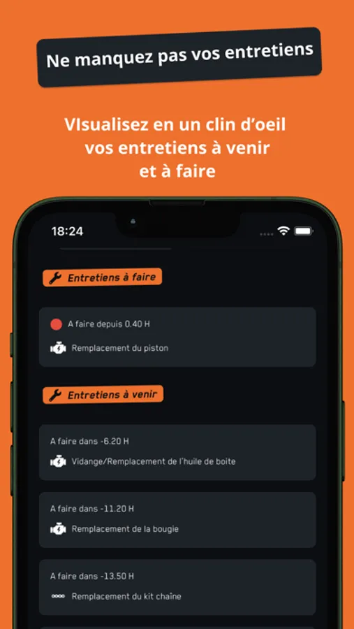 Sur chaque entretien , tu peux configurer la fréquence de l’entretien, ensuite les entretiens à faire ou à venir te seront mis en évidence sur l’application , tu seras informé du temps restant , pour ne pas les louper.