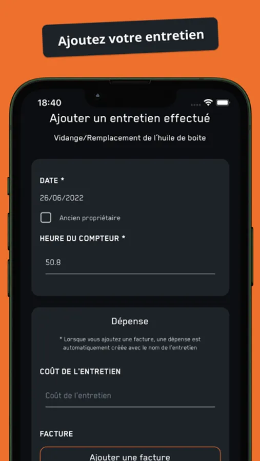 Sur chaque entretien, tu auras la possibilité de lier une dépense et d’y ajouter une facture.