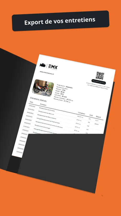 Sur EMX tu as la possibilité d’exporter tes entretiens au format papier , pratique pour le ranger dans tes classeurs ou l'imprimer, pour par la suite, les donner au futur acquéreur de votre véhicule en cas de vente, afin de garantir de la qualité de l’entretien et de l’amour donné à votre véhicule.