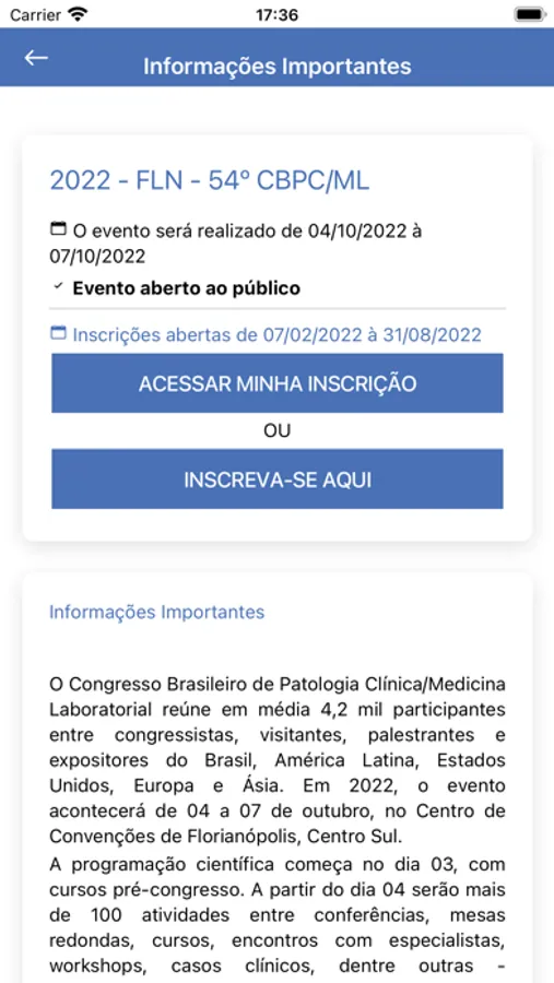 O Congresso Brasileiro de Patologia Clínica/Medicina Laboratorial reúne em média 4,2 mil participantes entre congressistas, visitantes, palestrantes e expositores do Brasil, América Latina, Estados Unidos, Europa e Ásia. Em 2022, o evento acontece de 4 a 7 de outubro, no CentroSul Centro de Convenções, em Florianópolis-SC.