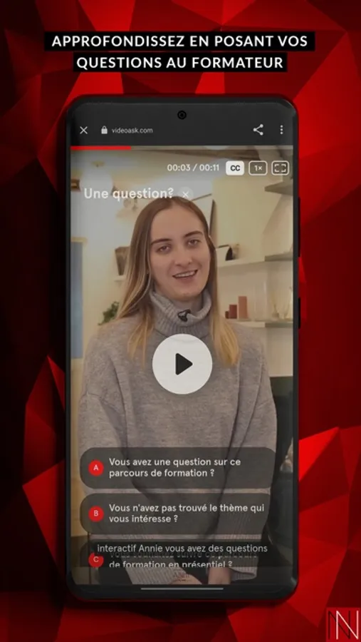 Avec ANNIE, vous pourrez suivre des parcours de formation de votre choix depuis votre téléphone mobile ou votre tablette sans limites et à votre rythme. Vous avez une question ? Posez-la à votre formateur directement depuis l'application. Il vous répondra en vidéo.