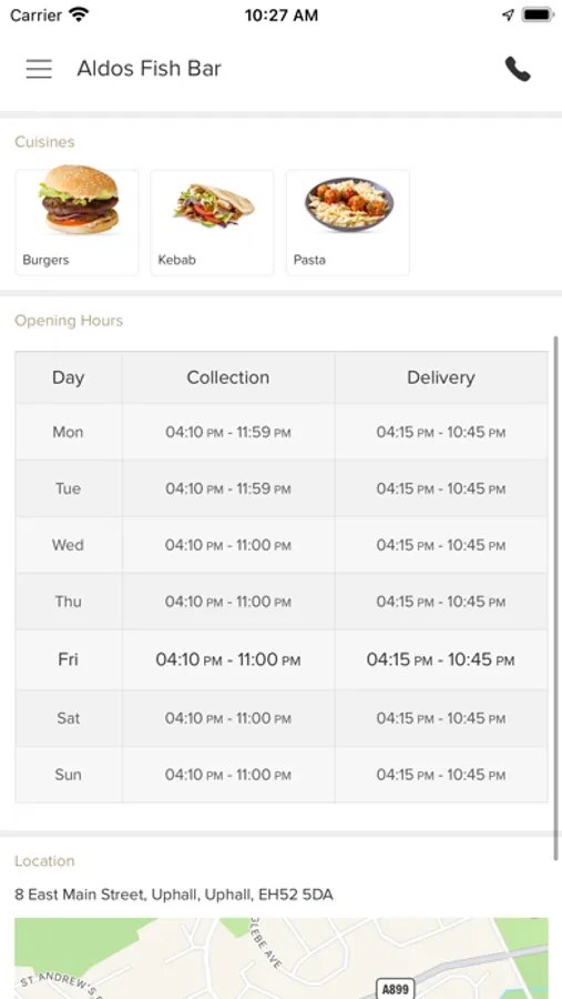 Aldos Fish Bar is located in Uphall. Here at Aldos Fish Bar, we’re proud to offer some of the tastiest fish and chips in the City, on our menu you can also find all your other chip shop favourites such as burgers, wraps, and more! All our authentic food is freshly prepared with the finest ingredients and cooked to perfection by our skilled chefs.