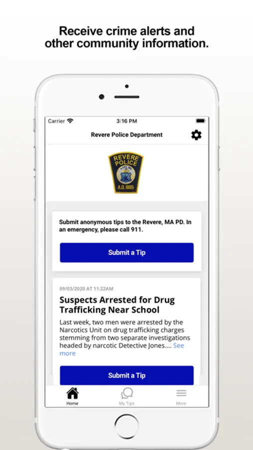 The Revere PD app provides citizens the ability to submit anonymous tips to the Revere, MA Police Department. The app also displays agency crime alerts and other organization web and social media content.
