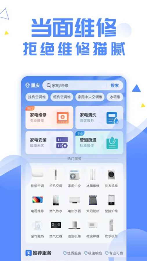 全国上门的家庭服务平台,服务包含上门家电维修、管道疏通、水电维修、防水漏补、墙面翻新、家居门窗、家电清洗、数码办公8大服务范围,具体涵盖近百种维保服务品类。为您提供专业、优质、有保障的一站式生活服务,随叫随到,为您解决生活中的小麻烦。