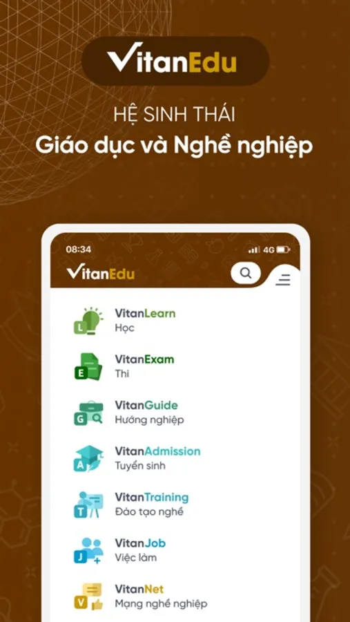 VitanEdu được thiết kế mô phỏng toàn bộ quá trình học tập và làm việc của một người gắn liền với 3 giai đoạn và bao gồm 8 khối chức năng chính: