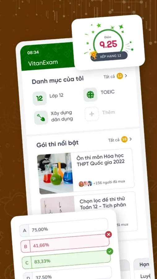 Cung cấp đề thi với ngân hàng gồm hàng trăm ngàn câu hỏi; hỗ trợ người học đánh giá năng lực học tập; nhận diện vùng kiến thức còn hạn chế qua các bài kiểm tra trắc nghiệm; tạo phòng thi đấu trực tuyến cùng với bạn bè và cộng đồng.