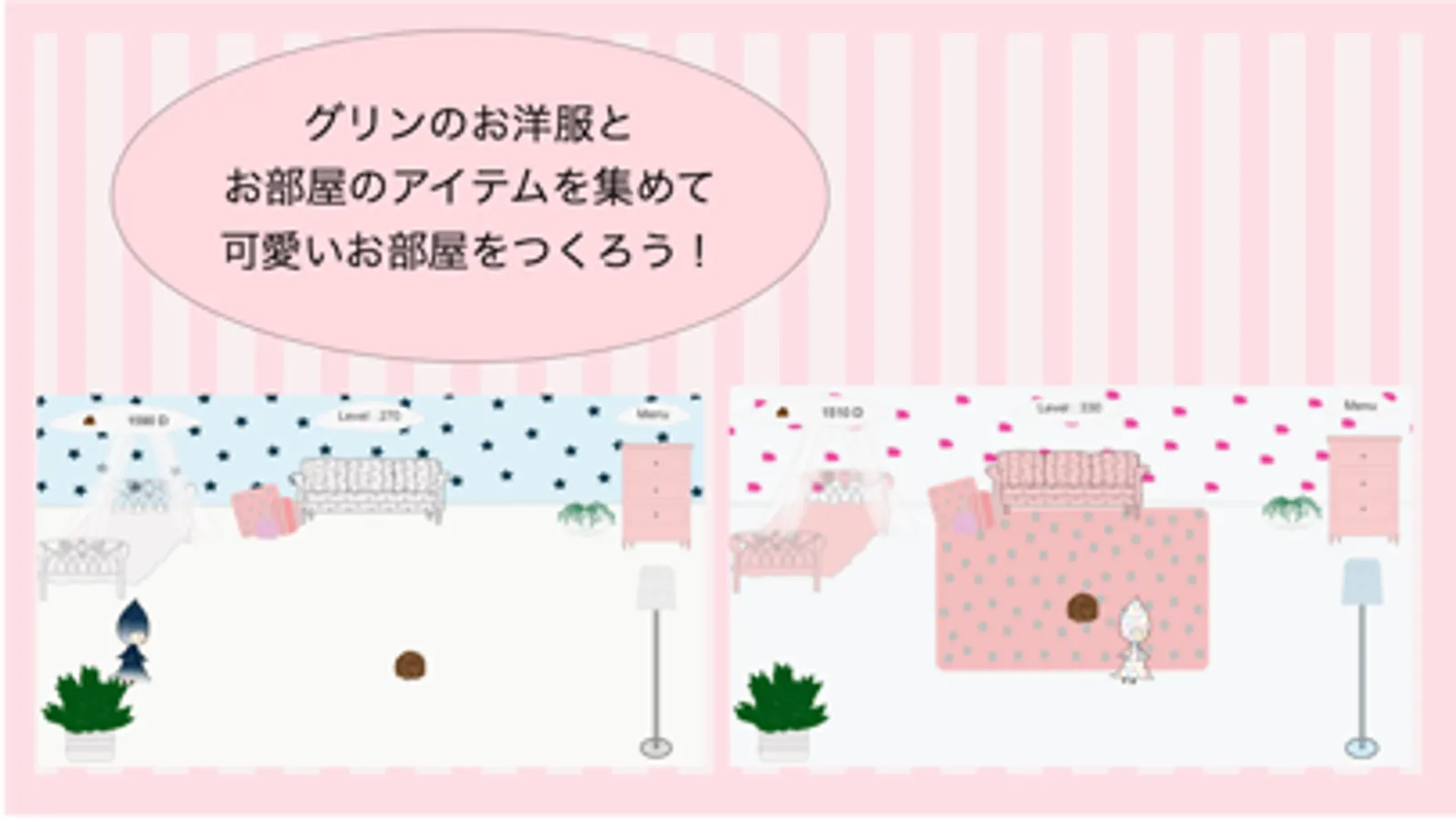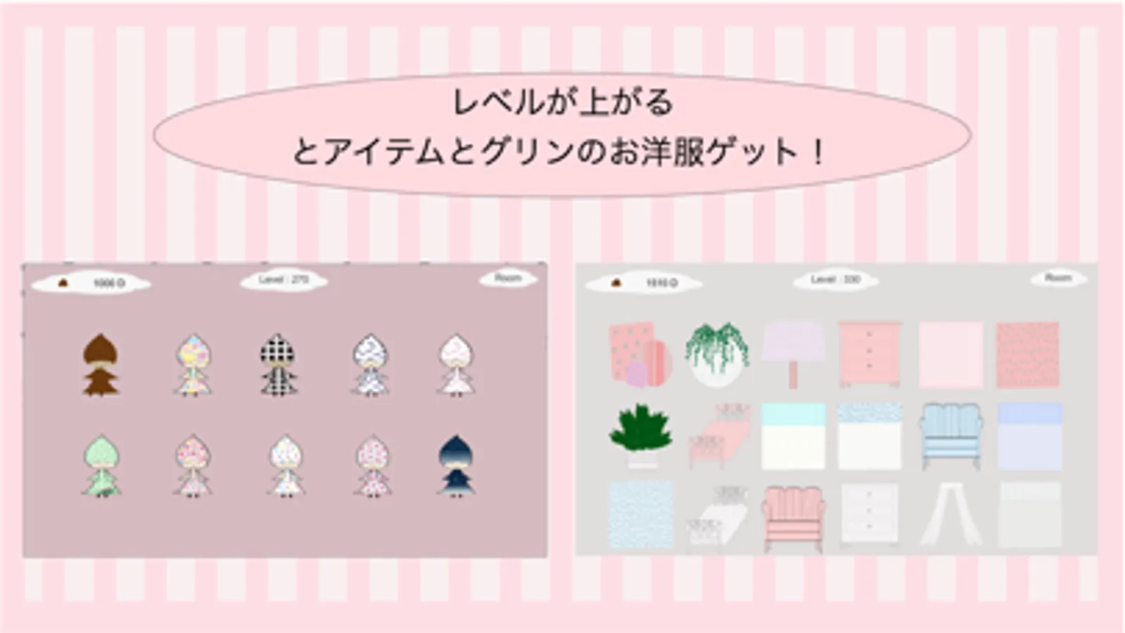 レベルが上がるとお部屋のアイテムとグリンちゃんのお洋服ゲット!