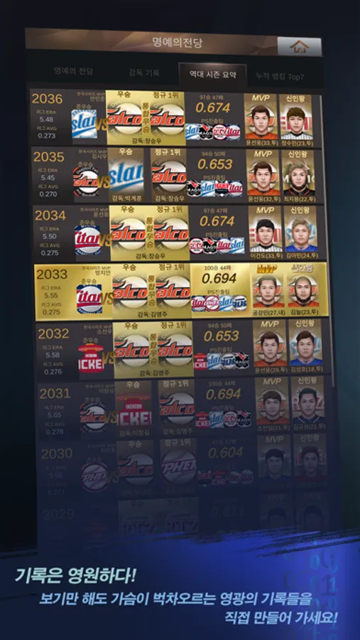 6. 게임을 어느 정도 진행하시면 명예의 전당, 타팀으로부터의 단장 스카웃 제의, 100년 후 환생 등의 히든 컨텐츠를 만나보실 수 있습니다.