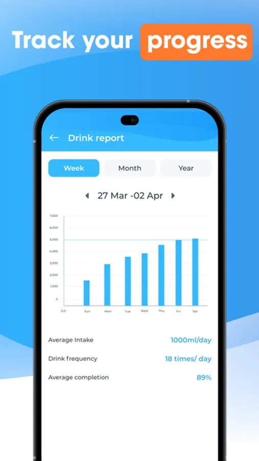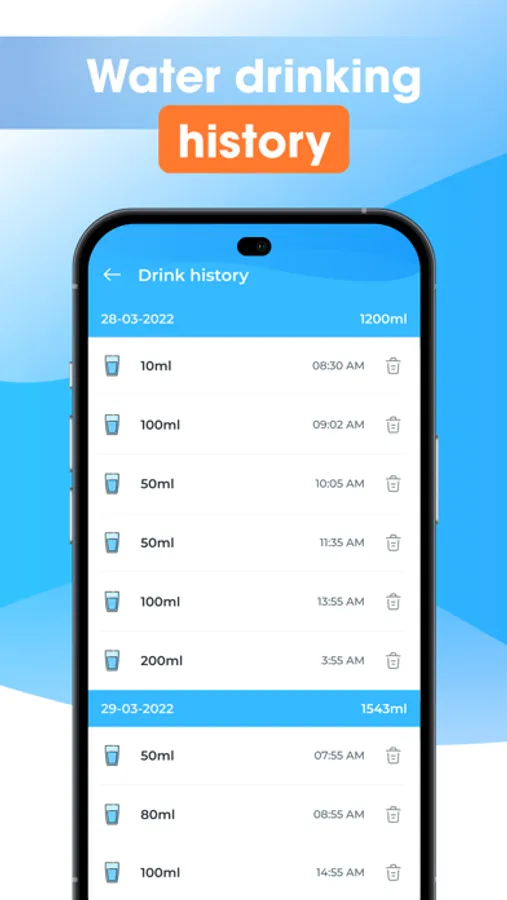 This drink water app also shows your drinking history throughout the day with the amount of water intake. It can display your weekly, monthly water intake with your average amount of water per day. drink frequency and your average of completion.
