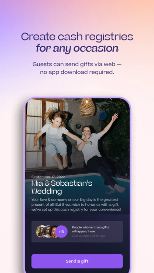 Send cash gifts instantly to anyone, for any occasion. To give, just define the amount, choose from a range of digital art for every occasion, and send via text or email. To receive, just tell us where to deposit. With one tap, the right gift is delivered instantly at any moment, for less than the price of a paper greeting card.