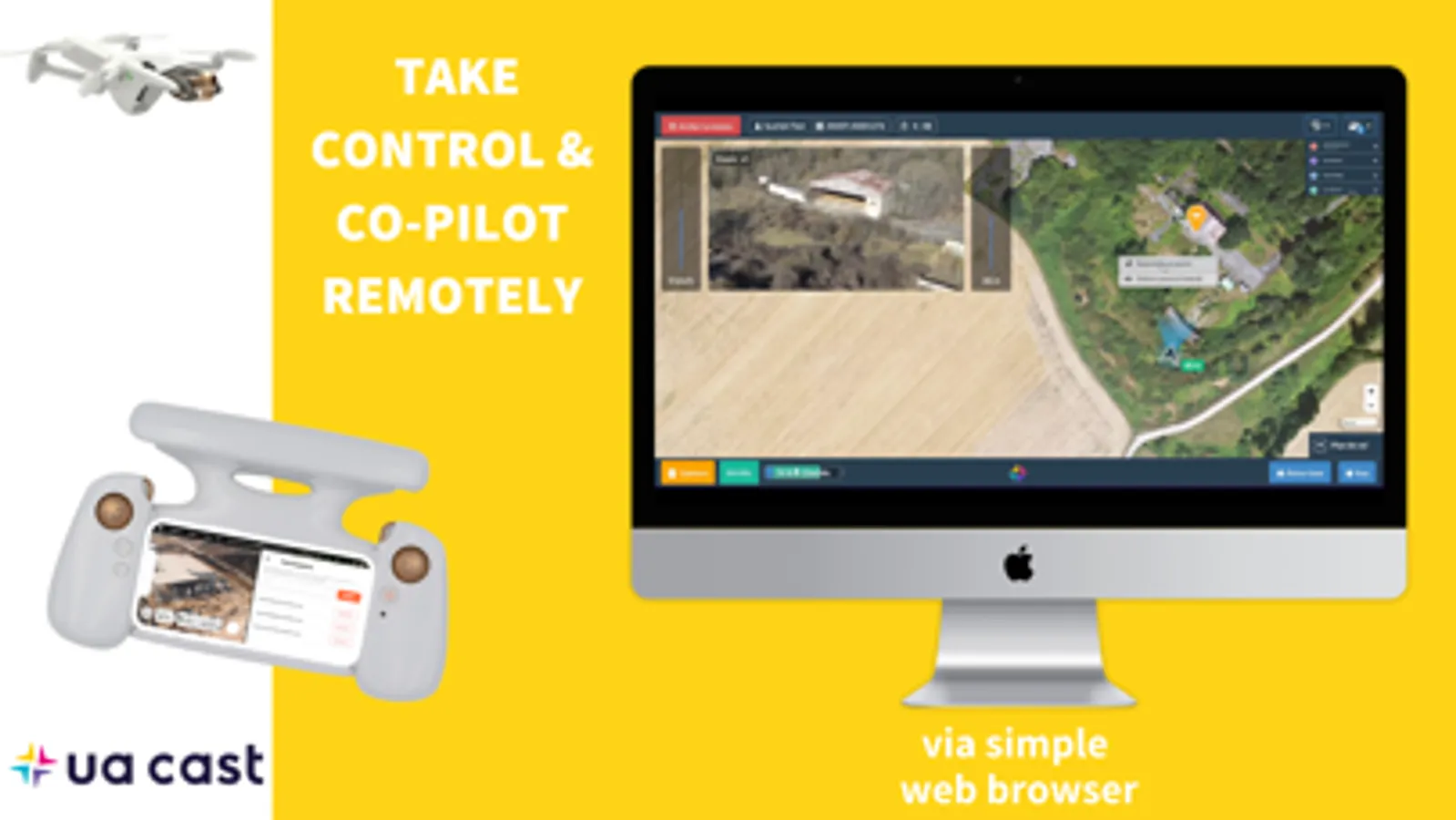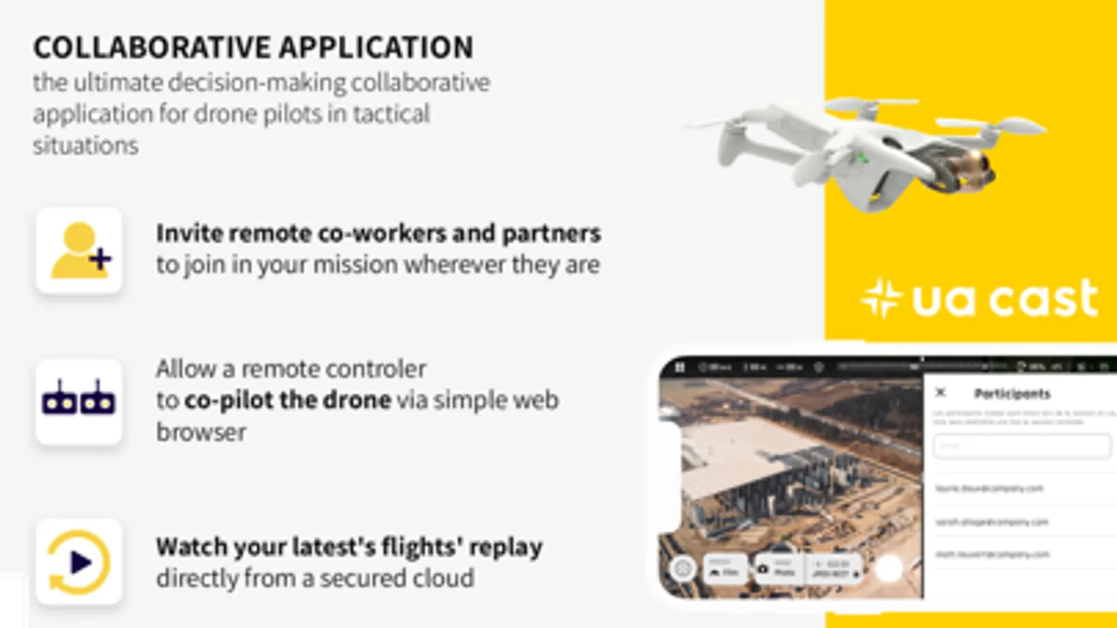 ua cast is an app based on Parrot's (FreeFlight7) app. It allows you both to remotely pilot your Anafi Ai in the traditional way and to give the possibility to a remote teammate to co-pilot the drone through an intuitive web interface.