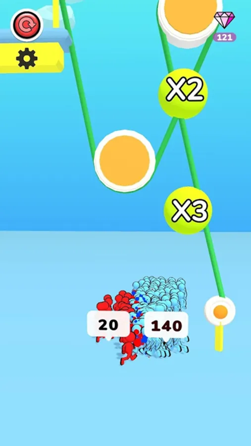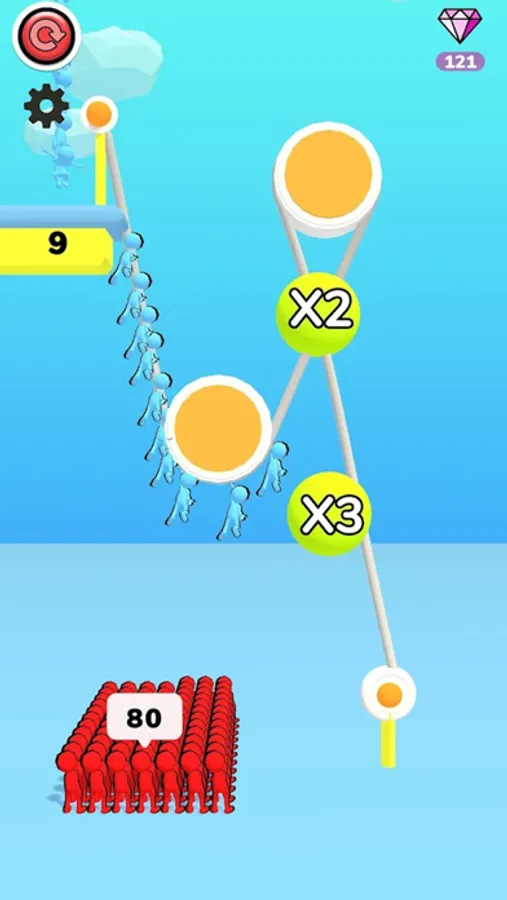 Here you guide your people down multipliers to that they increase in number. Cleverly wrap your rope around the pegs to make sure you get as many people as possible.
